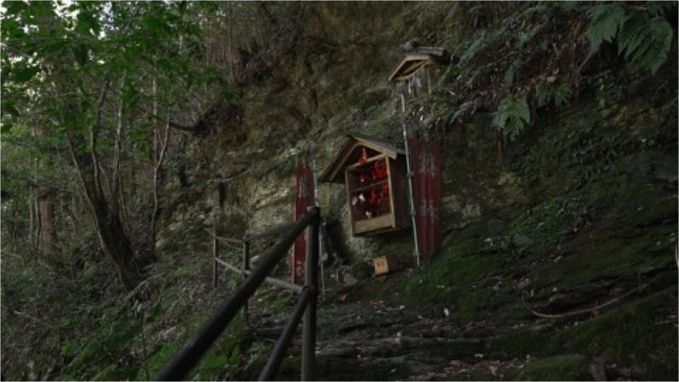 在中山神社境内的神圣森林深处,沿着本殿后方陡峭而狭窄的山道上行,便可抵达猿神社。这是一座小巧的茅草屋顶建筑,依岩壁而建,相传其中供奉的是出现在12世纪佛教故事集中的猿之灵。