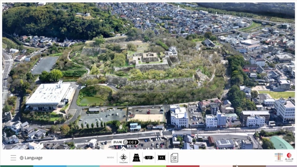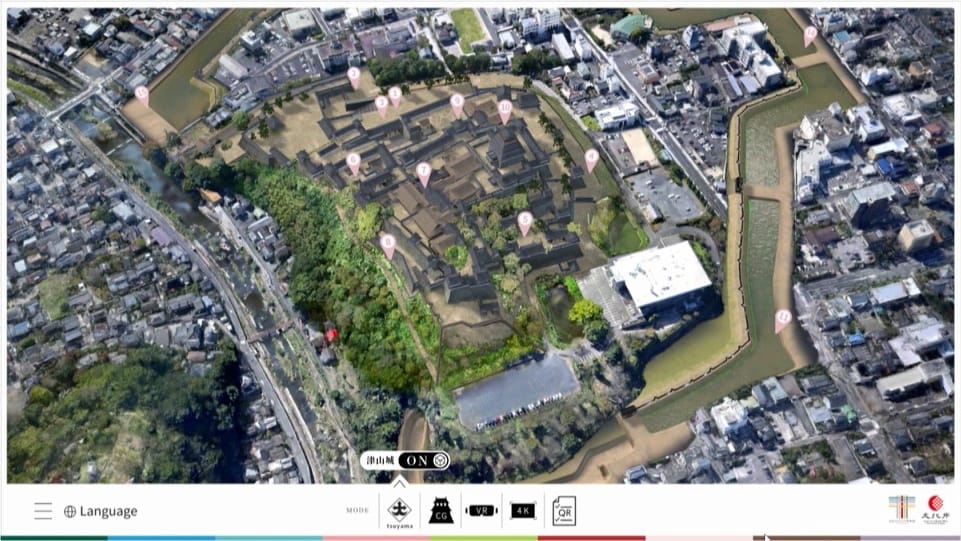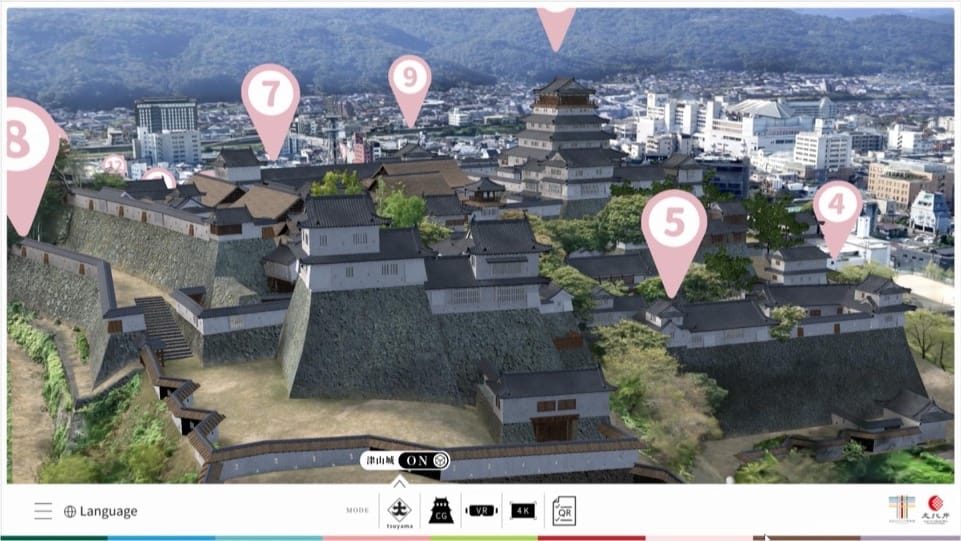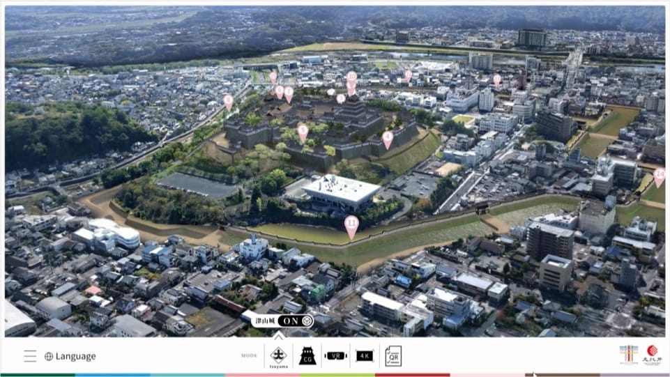 “津山城模式”呈现津山城的三维重建模型,叠加呈现在今天的津山市景观之上。