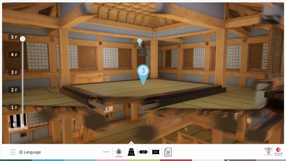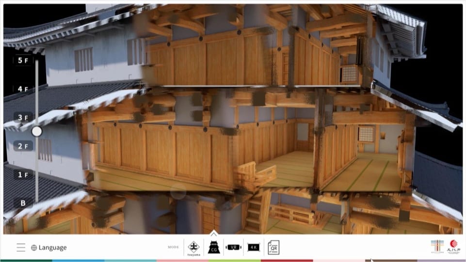您可以移动视角,探索各层的空间与构造,宛如亲身穿行于天守之中,身临其境地感受天守的建造方式及其承担的功能。